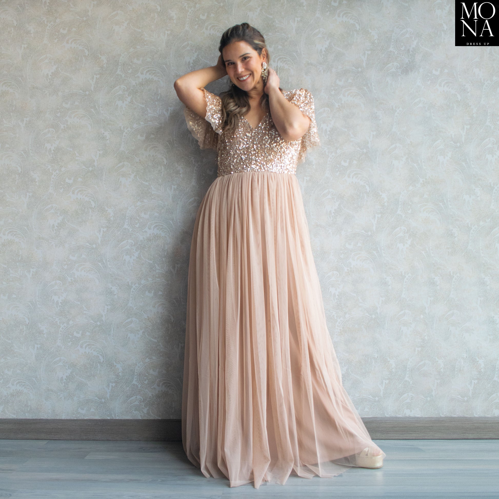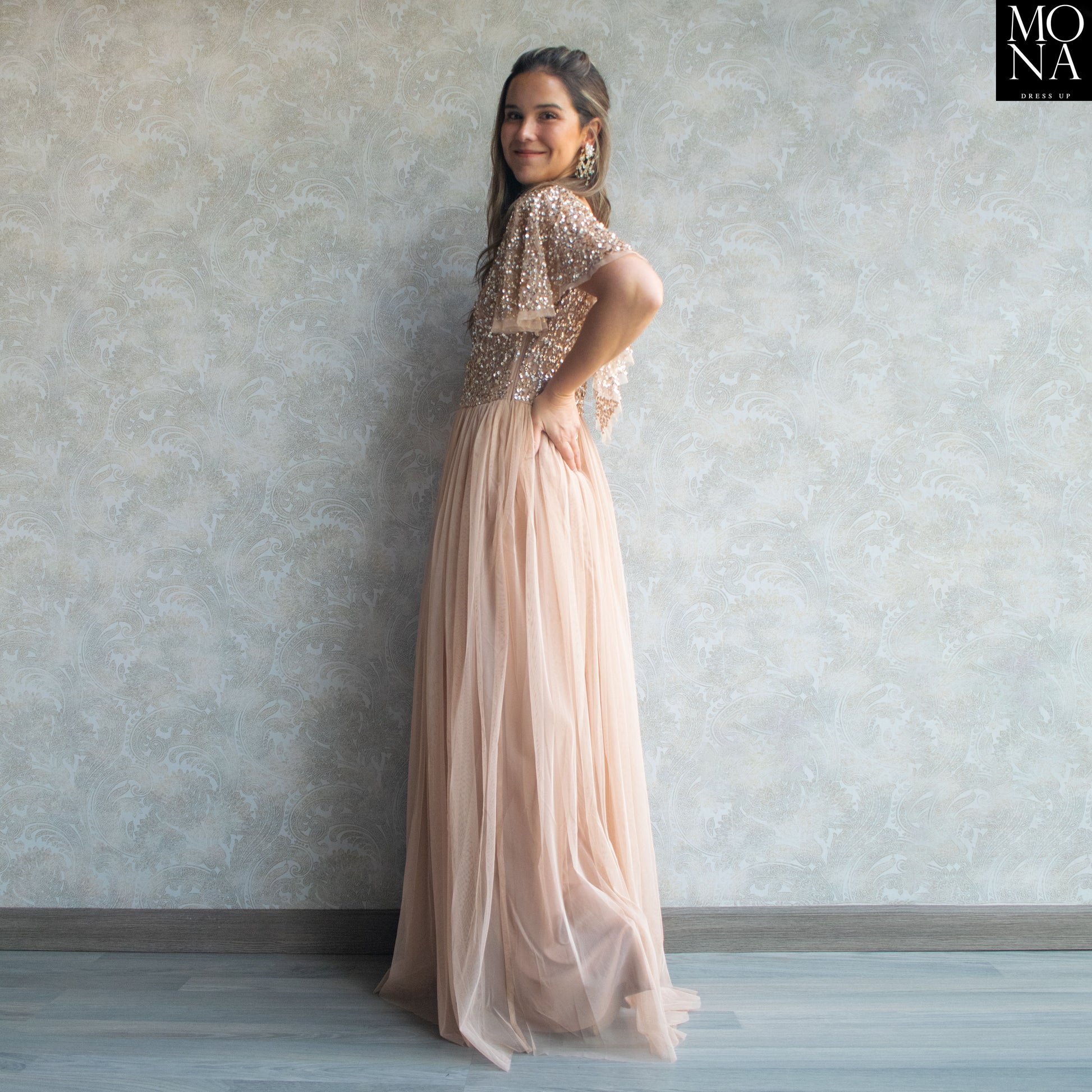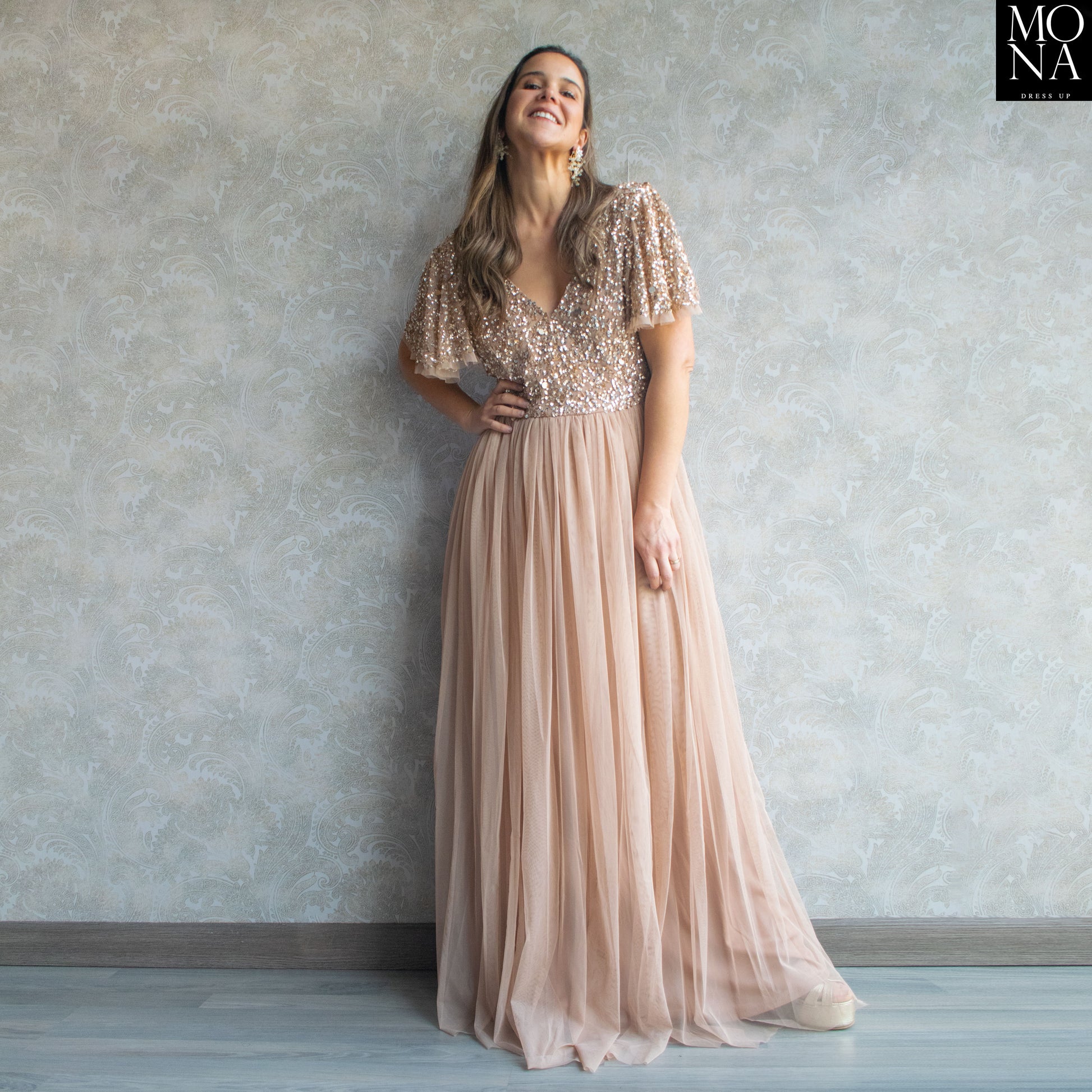 ¿Amante de los brillos pero sin perder el toque delicado? El vestido Begoña es todo lo que buscabas. La parte superior está cubierta de lentejuelas nude que reflejan la luz con cada movimiento, mientras que la falda de tul vaporoso le da una caída suave y etérea. Tiene mangas sueltas tipo mariposa que aportan un aire muy femenino, escote en V y una espalda en U que deja ver justo lo necesario. Es un vestido que mezcla lo romántico con lo protagonista de una forma armónica y soñada.