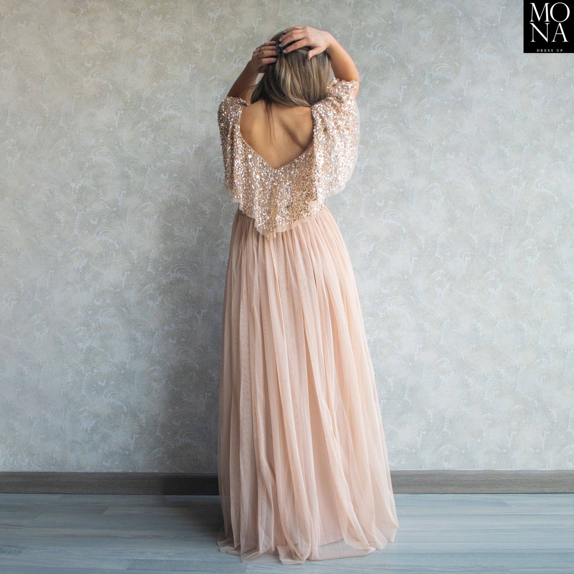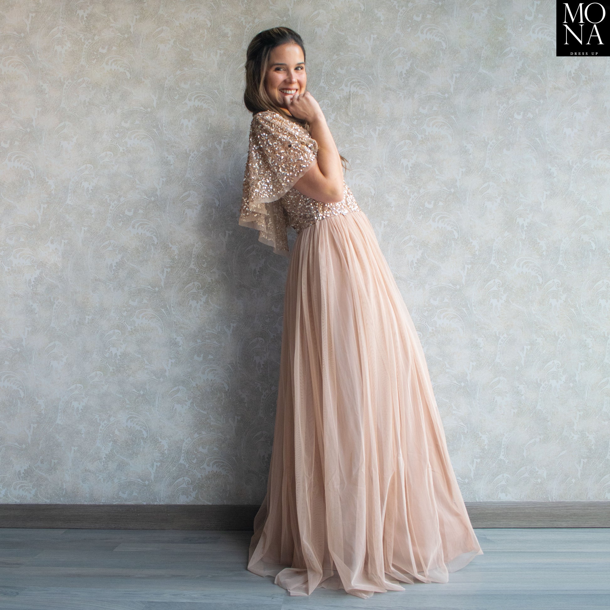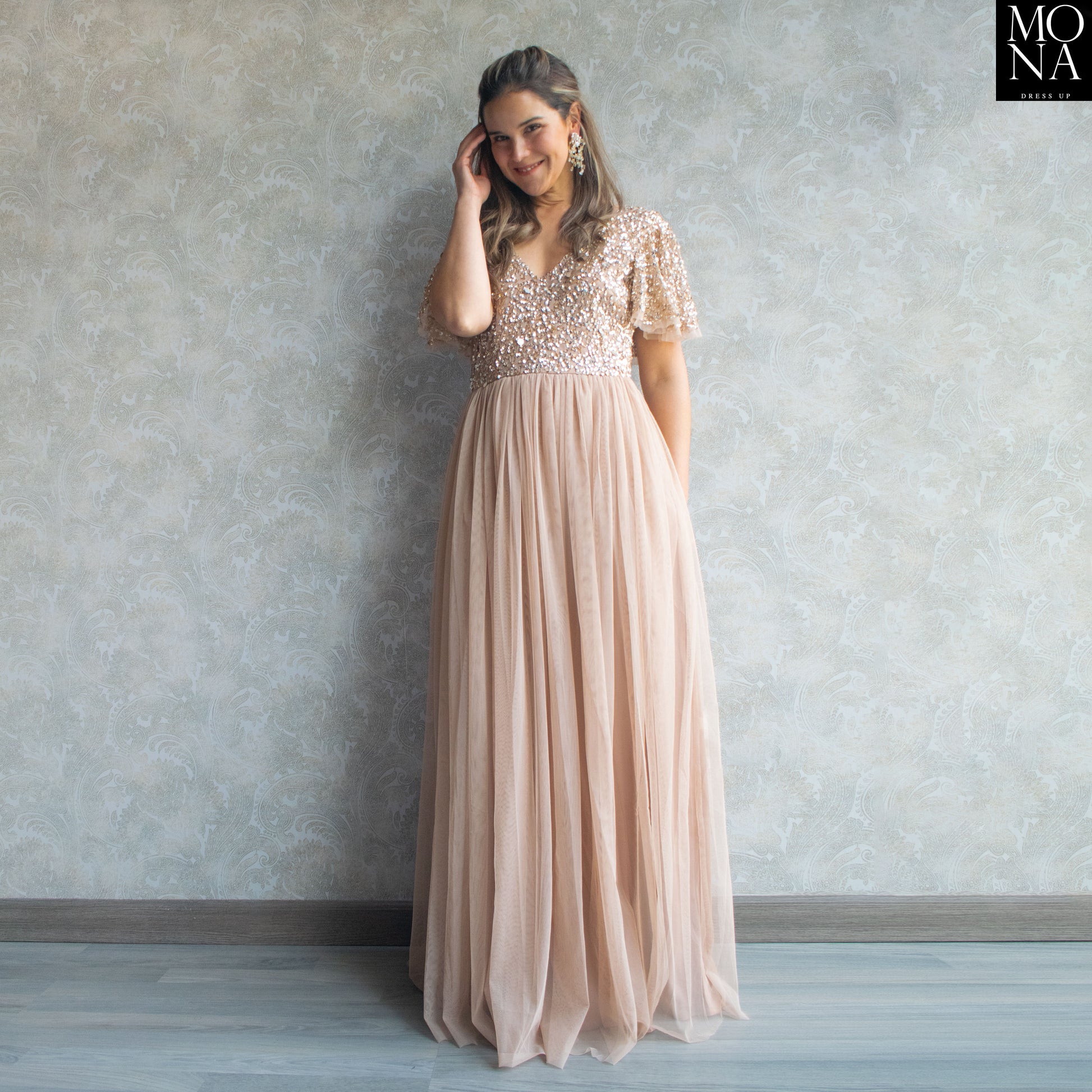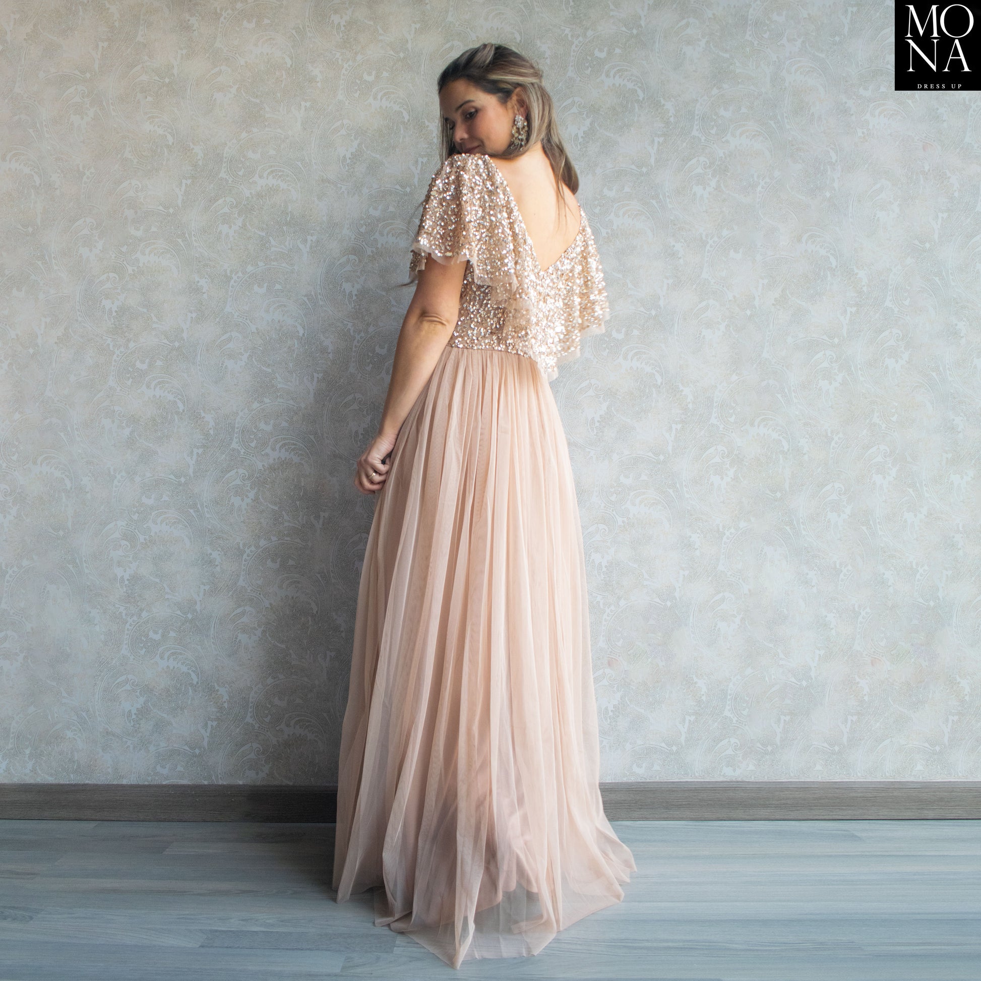 ¿Amante de los brillos pero sin perder el toque delicado? El vestido Begoña es todo lo que buscabas. La parte superior está cubierta de lentejuelas nude que reflejan la luz con cada movimiento, mientras que la falda de tul vaporoso le da una caída suave y etérea. Tiene mangas sueltas tipo mariposa que aportan un aire muy femenino, escote en V y una espalda en U que deja ver justo lo necesario. Es un vestido que mezcla lo romántico con lo protagonista de una forma armónica y soñada.