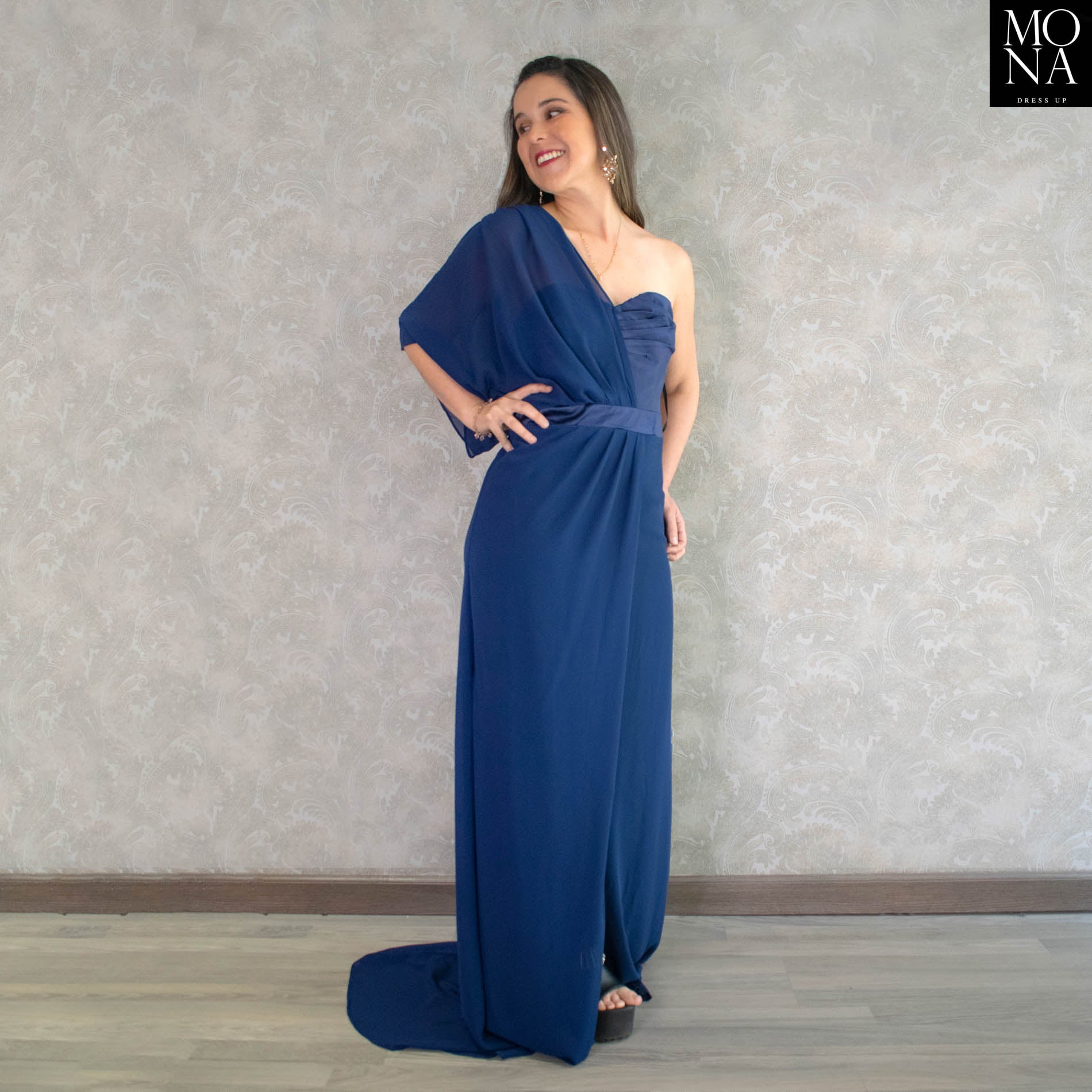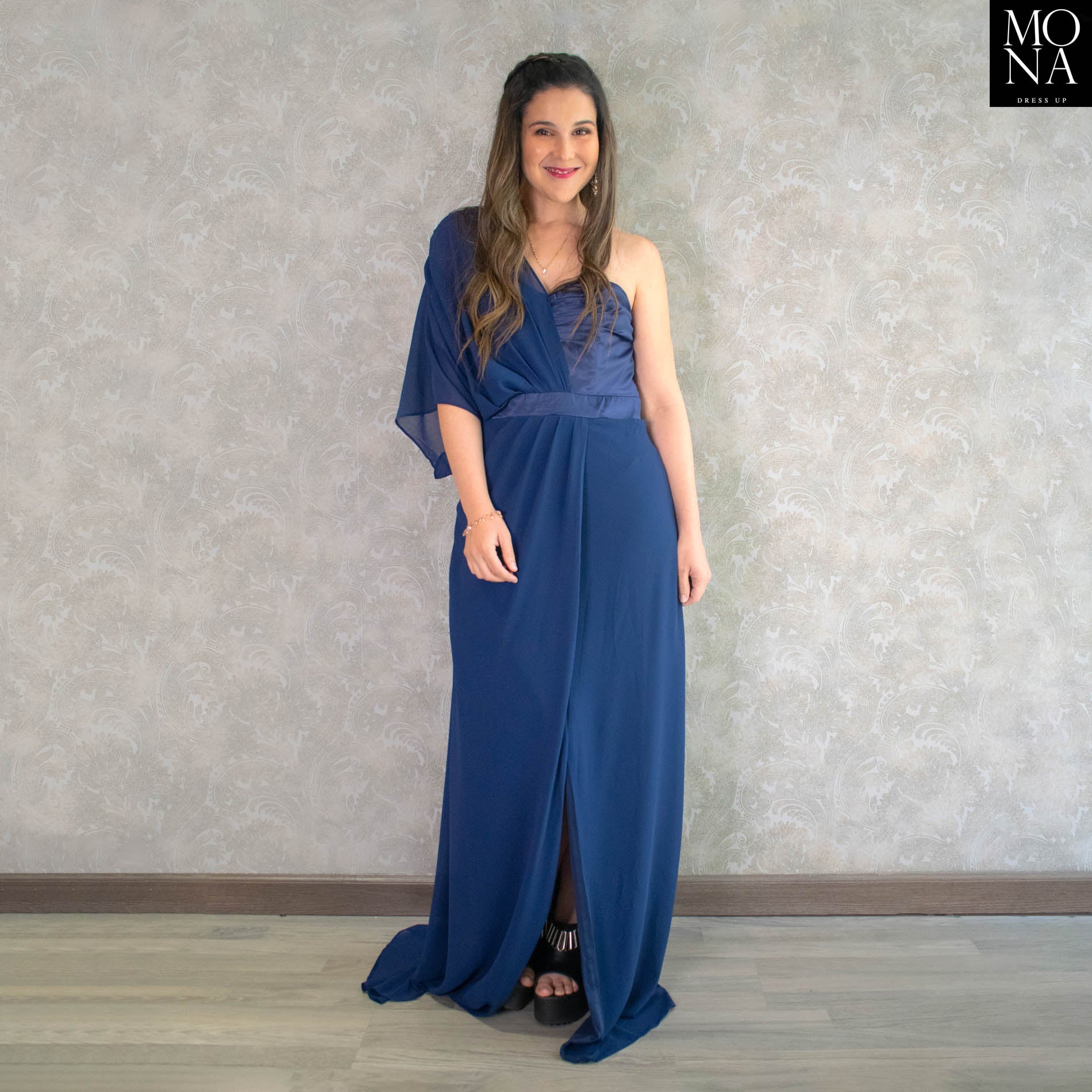 Si estás buscando un vestido que combine elegancia con un toque inesperado, el Carmina es de esos que no pasan desapercibidos. Tiene un diseño asimétrico precioso: un solo hombro con manga amplia tipo capa que cae liviana, mientras el otro lado queda completamente al descubierto. El contraste entre la gasa y la tela satinada en el cuerpo le da textura, movimiento y un aire muy moderno. Además, el tajo delantero en la falda es sutil pero aporta lo justo para lucir pierna con estilo.