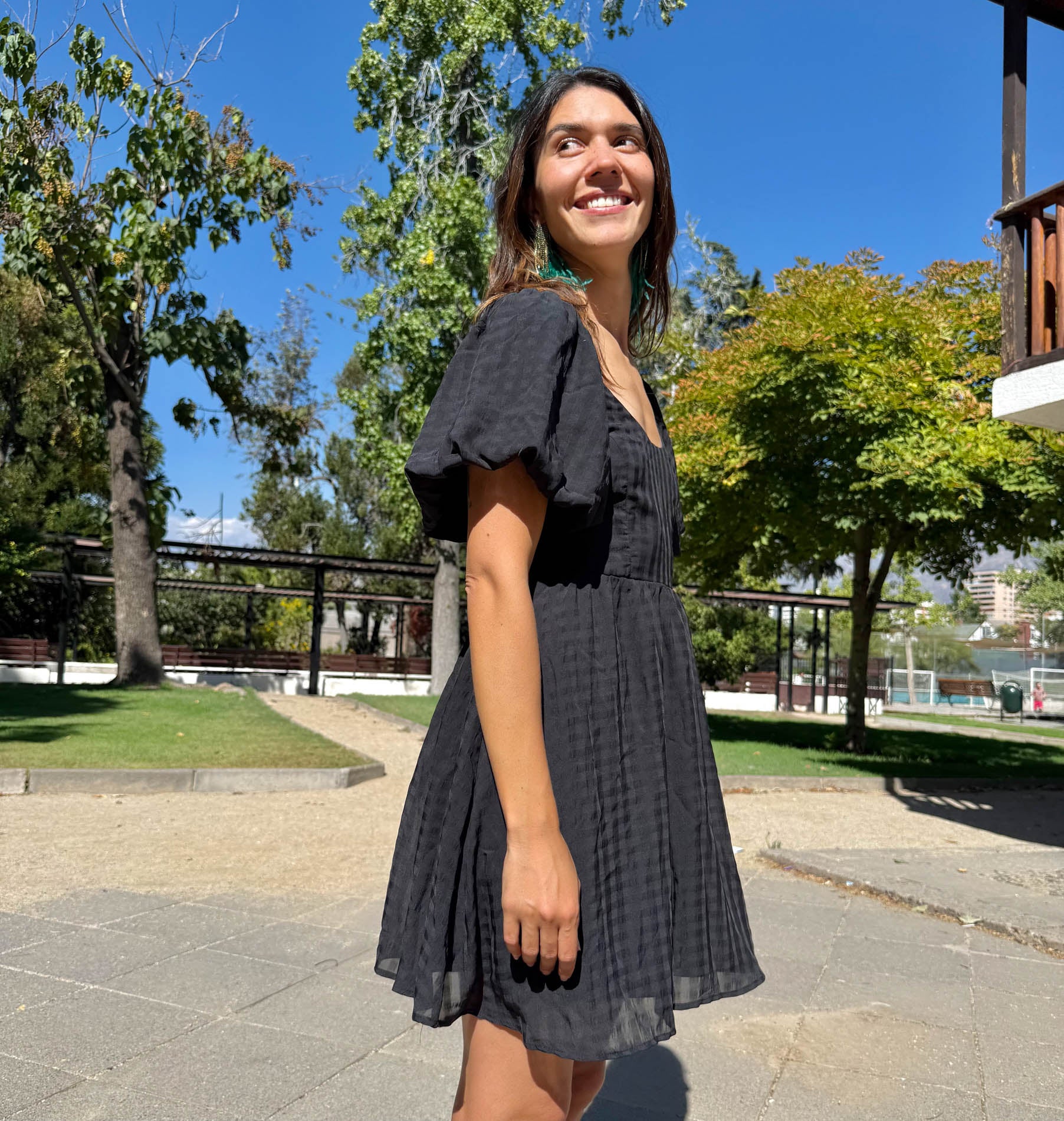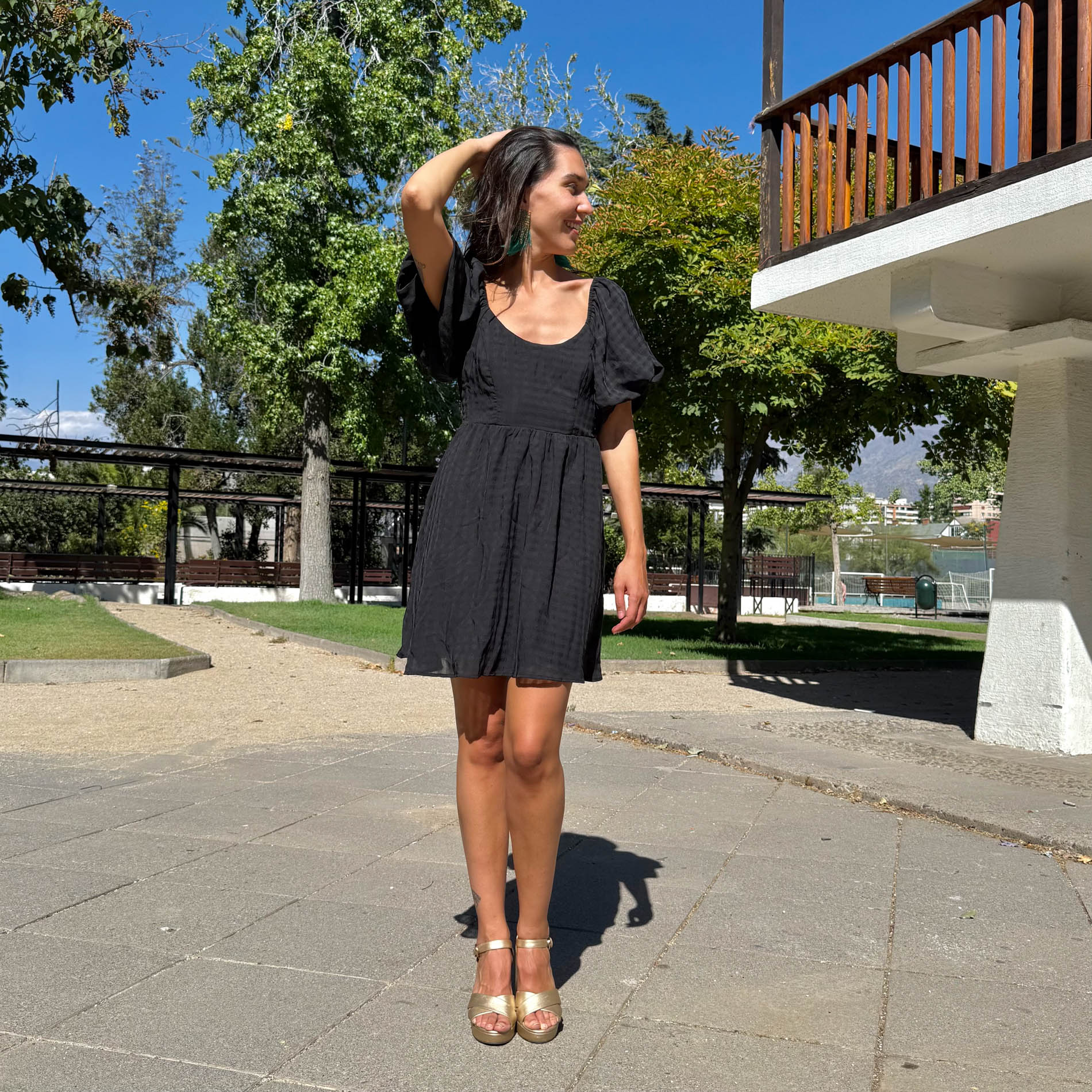Un básico con mucha onda. El vestido Agustina es ese modelo que te saca de apuros, pero sin pasar desapercibida. Tiene escote cuadrado, mangas cortas abullonadas y una espalda preciosa con elástico fruncido y lazos que lo hacen especial. La tela es liviana y tiene textura, así que se mueve contigo y no necesita mucho más para verse increíble.