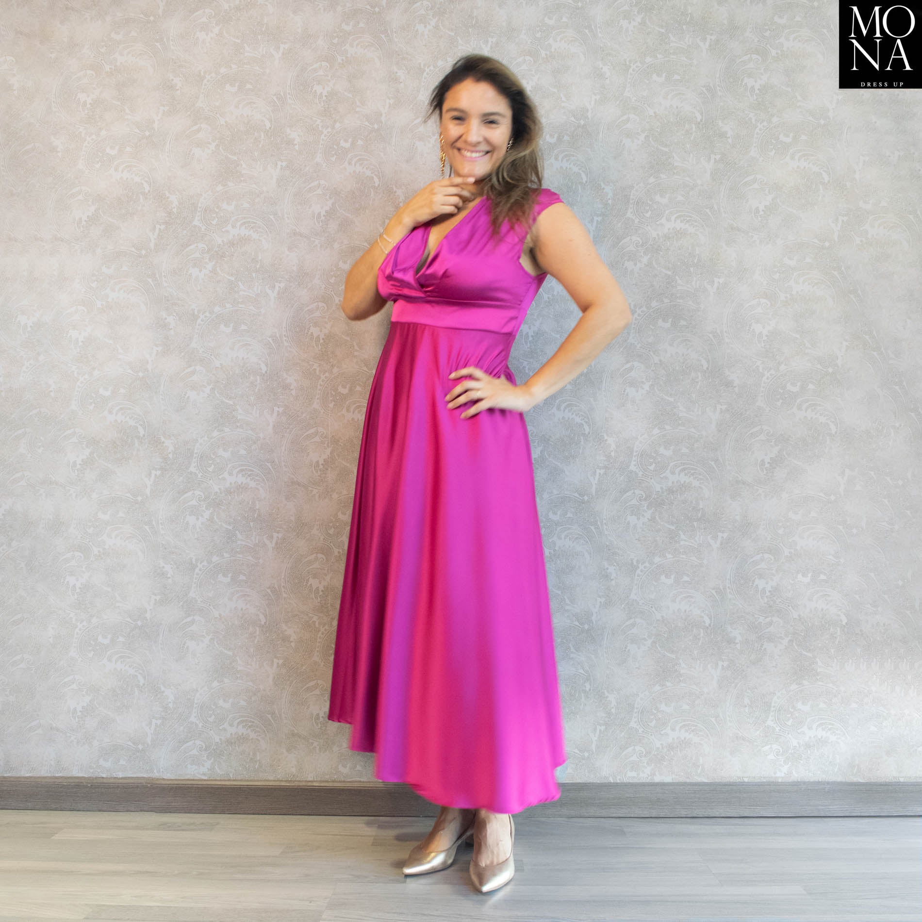 El vestido Magdalena es de esos modelos que te levantan el ánimo apenas te lo pones. Tiene un escote cruzado muy sentador, cintura marcada y una falda con vuelo que cae precioso al caminar. El largo o hace ideal para ocasiones elegantes pero donde puedes ir más cómoda, y el tono fucsia intenso es una bomba que ilumina al tiro.