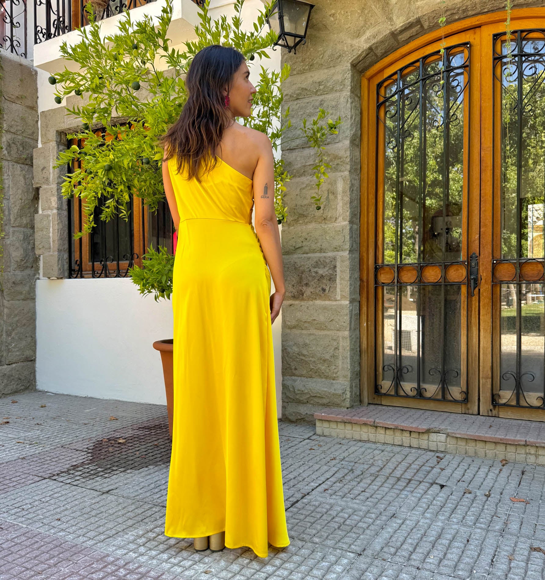 Si tu plan es robarte todas las miradas, el vestido Catalina es tu cómplice perfecto. Con su tono amarillo intenso, silueta fluida y detalle de flor en el hombro, tiene ese algo que lo hace inolvidable. El corte asimétrico deja un hombro al descubierto y se ajusta sutilmente en la cintura para después caer con movimiento suave y liviano.