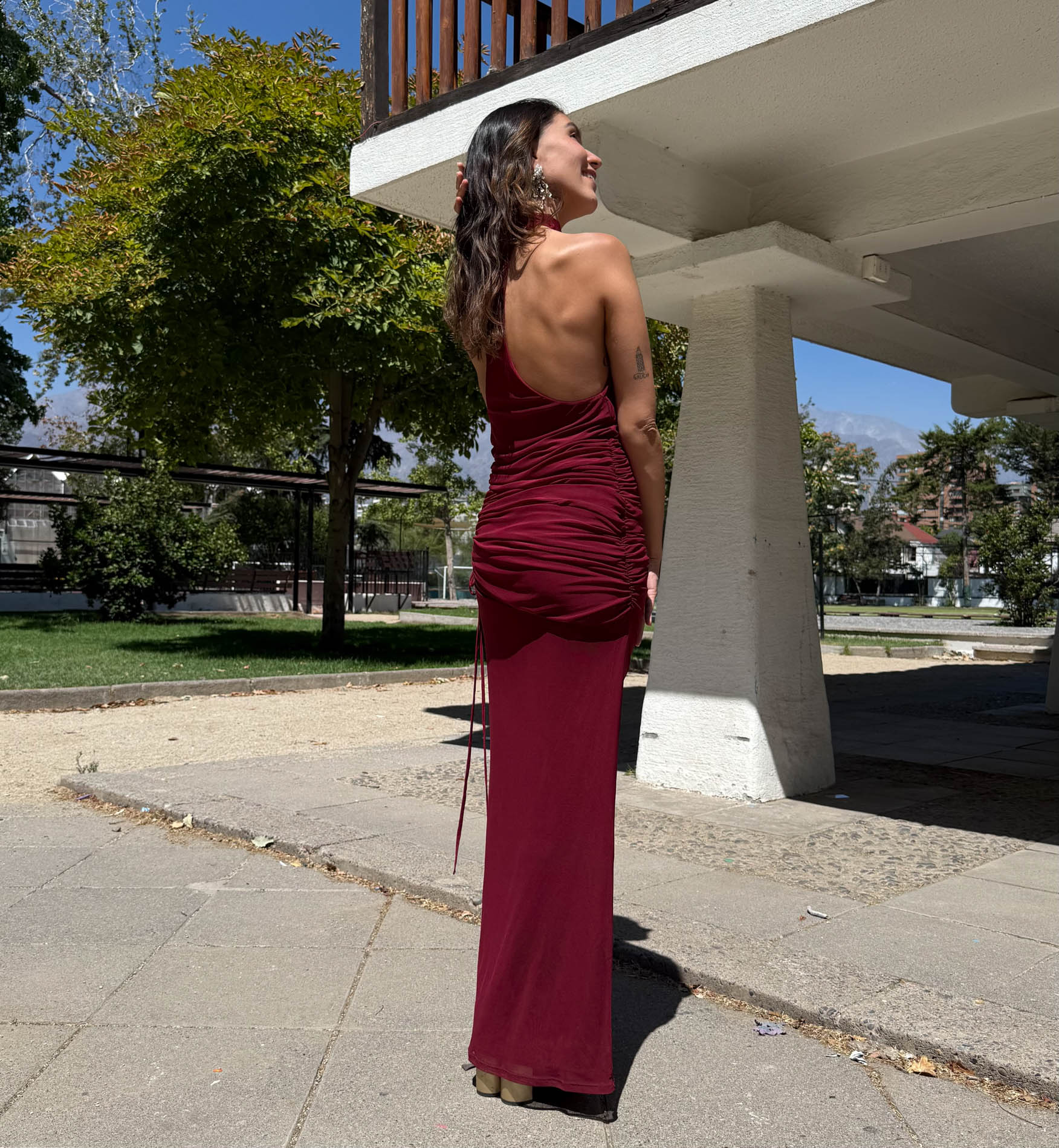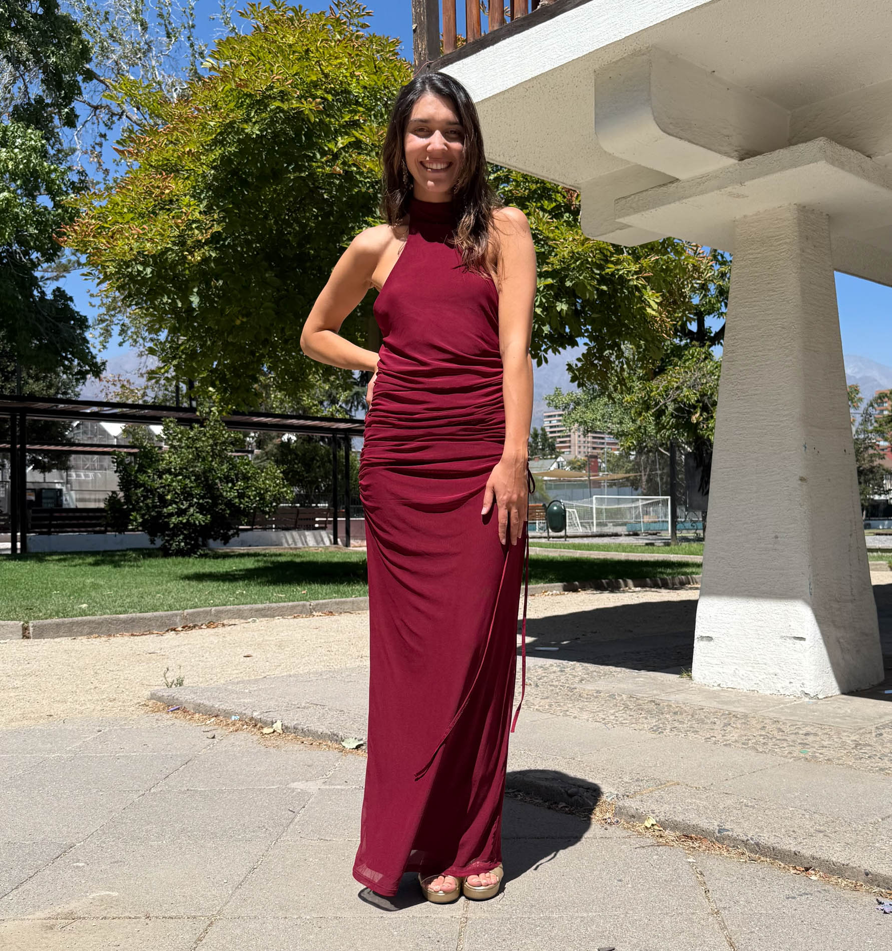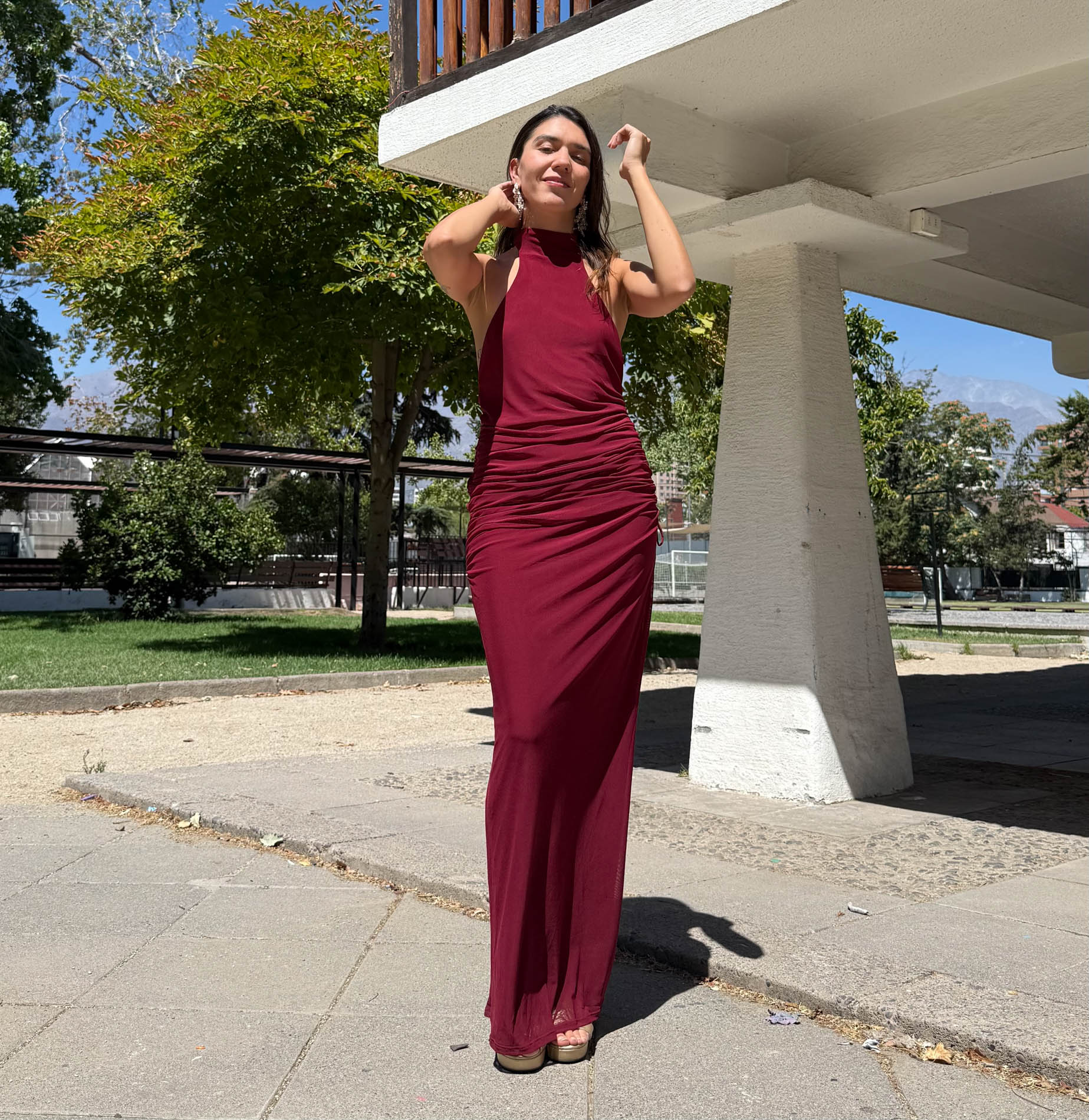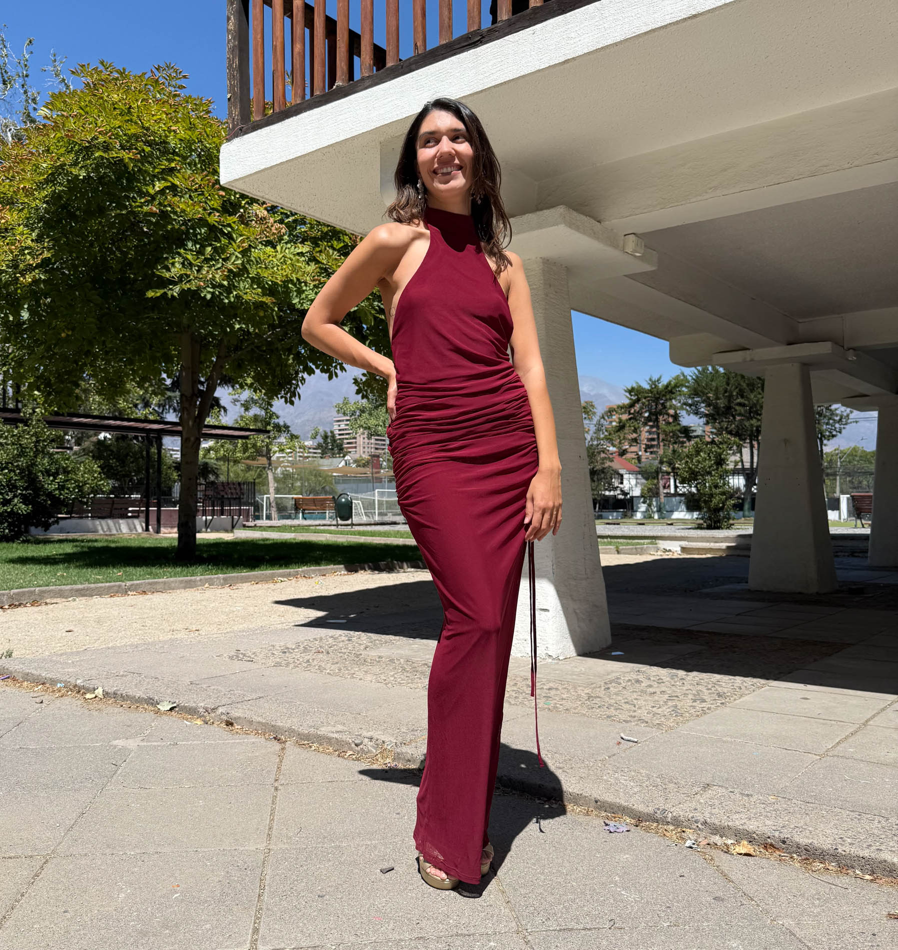 Este vestido es para las que quieren robarse todas las miradas, pero sin exagerar. El Consuelo tiene ese equilibrio perfecto entre onda y actitud: cuello halter cerrado al frente, frunces laterales que estilizan full y una espalda completamente descubierta que deja claro que llegaste a pasarlo bien. El tono burdeo le da ese toque elegante que nunca falla, pero el diseño dice "yo no soy fome". Ideal si quieres un look jugado, sentador y cómodo a la vez.