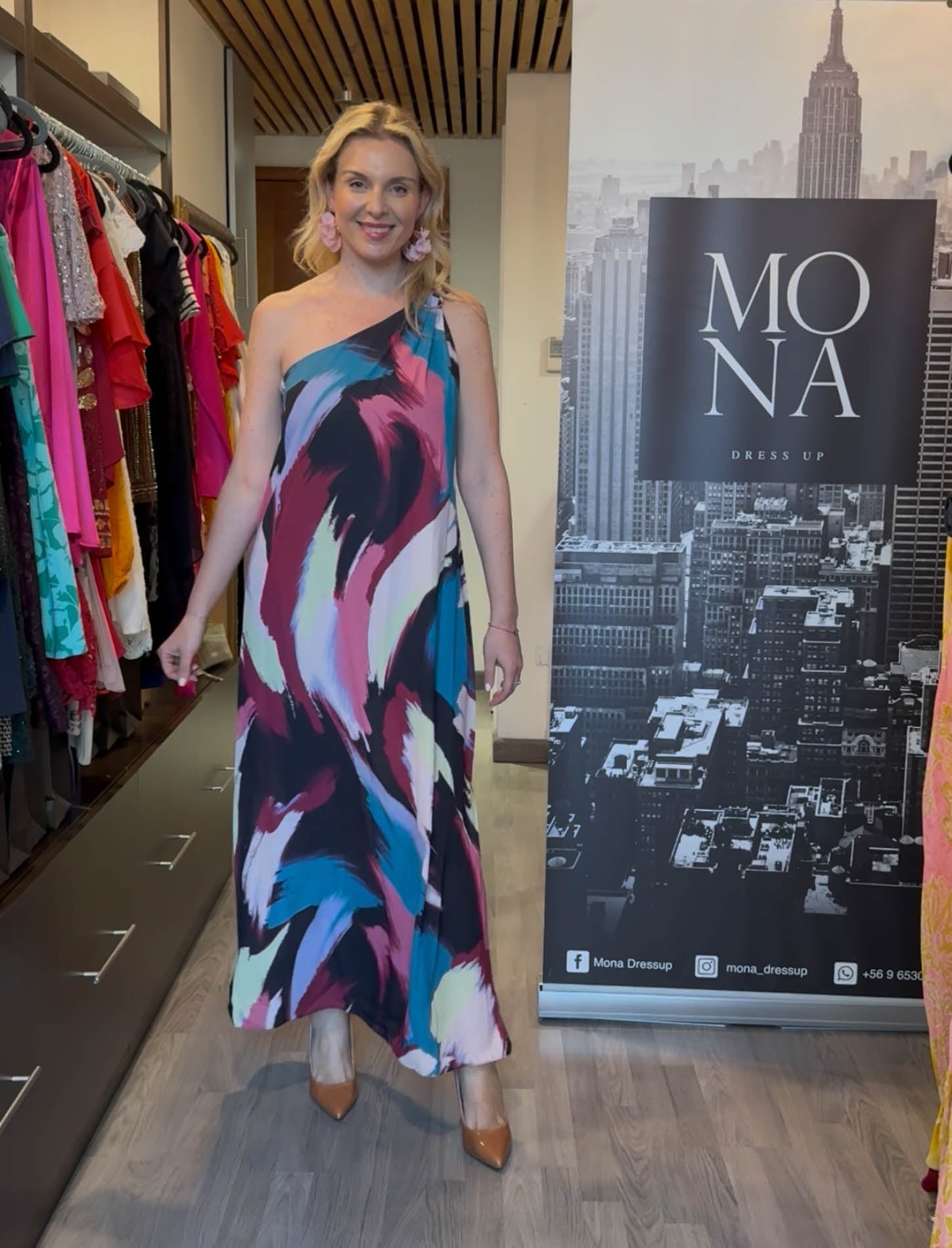 El diseño asimétrico de un hombro lo hace moderno y distinto, pero al mismo tiempo muy sentador. La caída es larga, fluida y liviana, perfecta para que el estampado se luzca en movimiento. No marca de más, no aprieta, y estiliza gracias a la línea vertical que genera el corte.