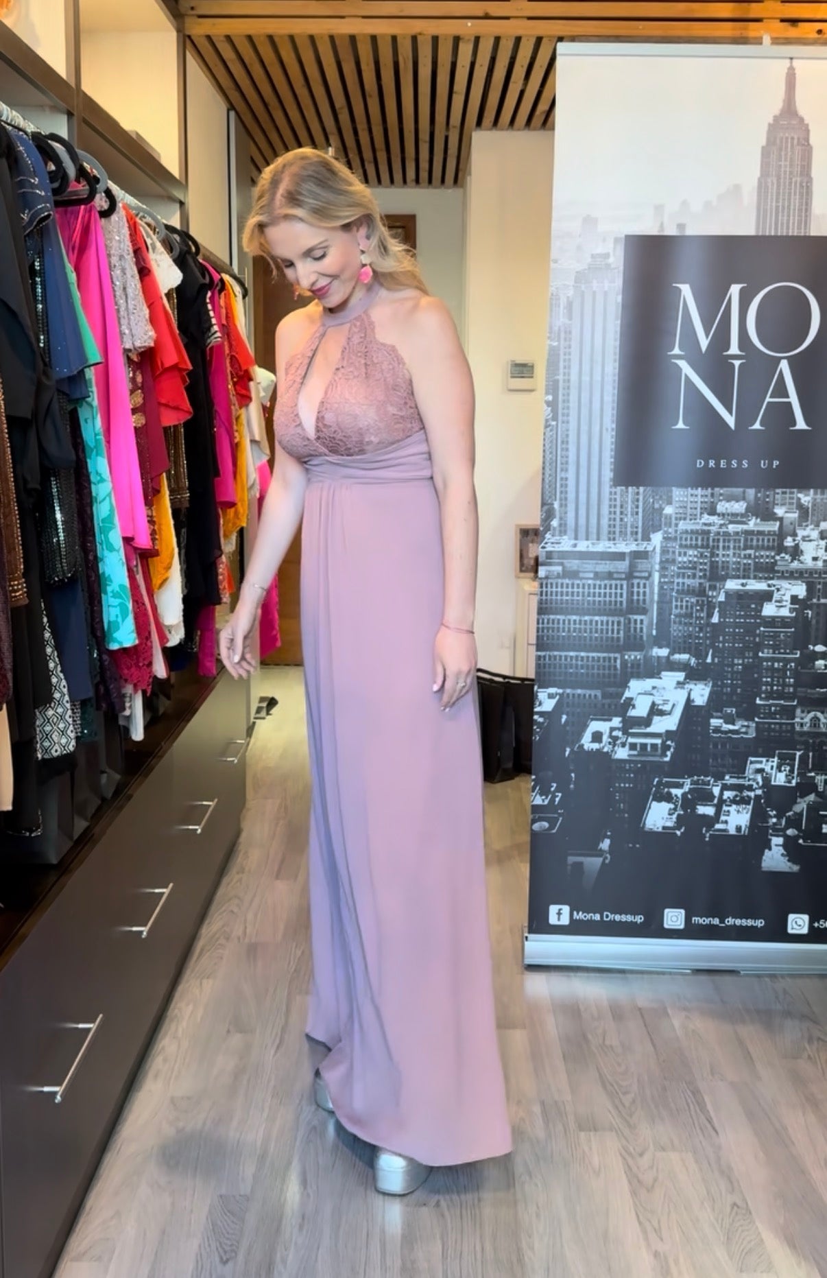 El vestido es Hermoso 😍 … lo acompañé con unos aritos que también compré en la tienda,.. La Fran un 7… mucha paciencia y disposición a que uno se vaya feliz con su compra!! De verdad me salvó en mis 2 eventos que tenía ❤️, totalmente recomendado