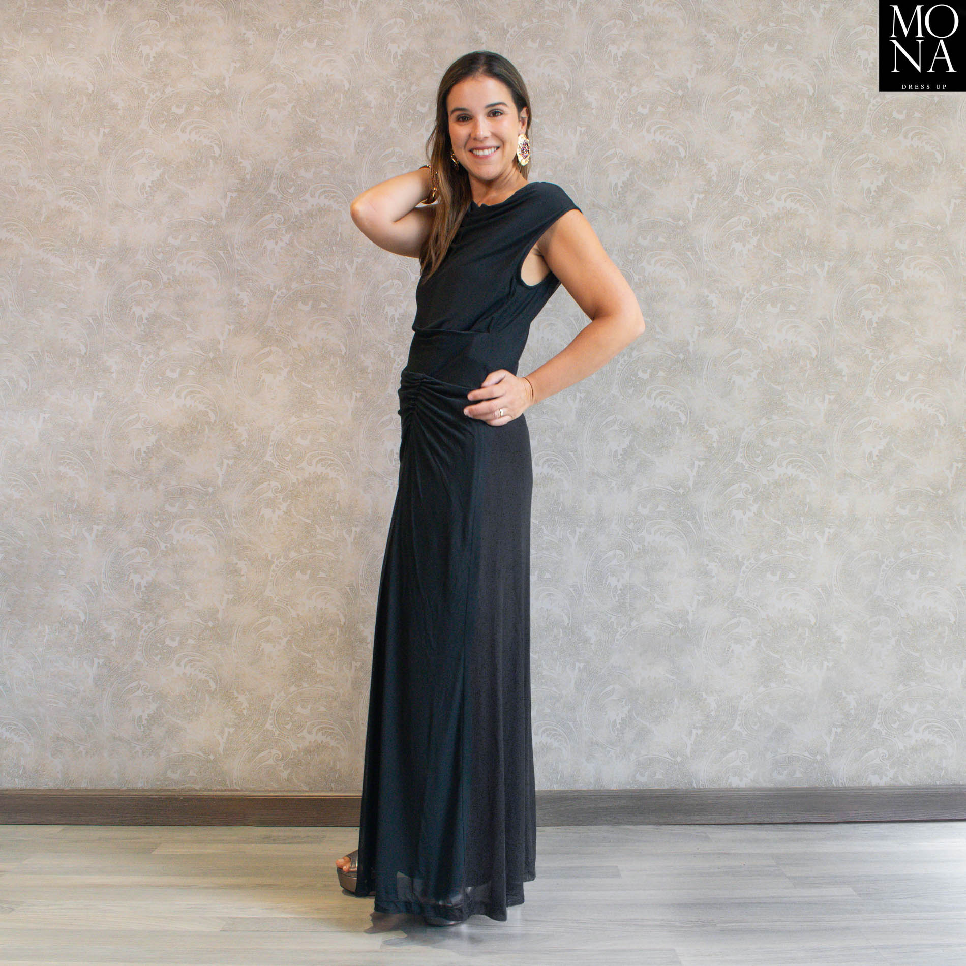 El escote tipo bote suavemente drapeado le da un aire moderno y elegante (pero sin exagerar), y el fruncido central crea una línea vertical que alarga visualmente la figura. La falda cae recta y fluida hasta el suelo, con movimiento liviano en el ruedo, lo que hace que al caminar se vea aún más lindo.