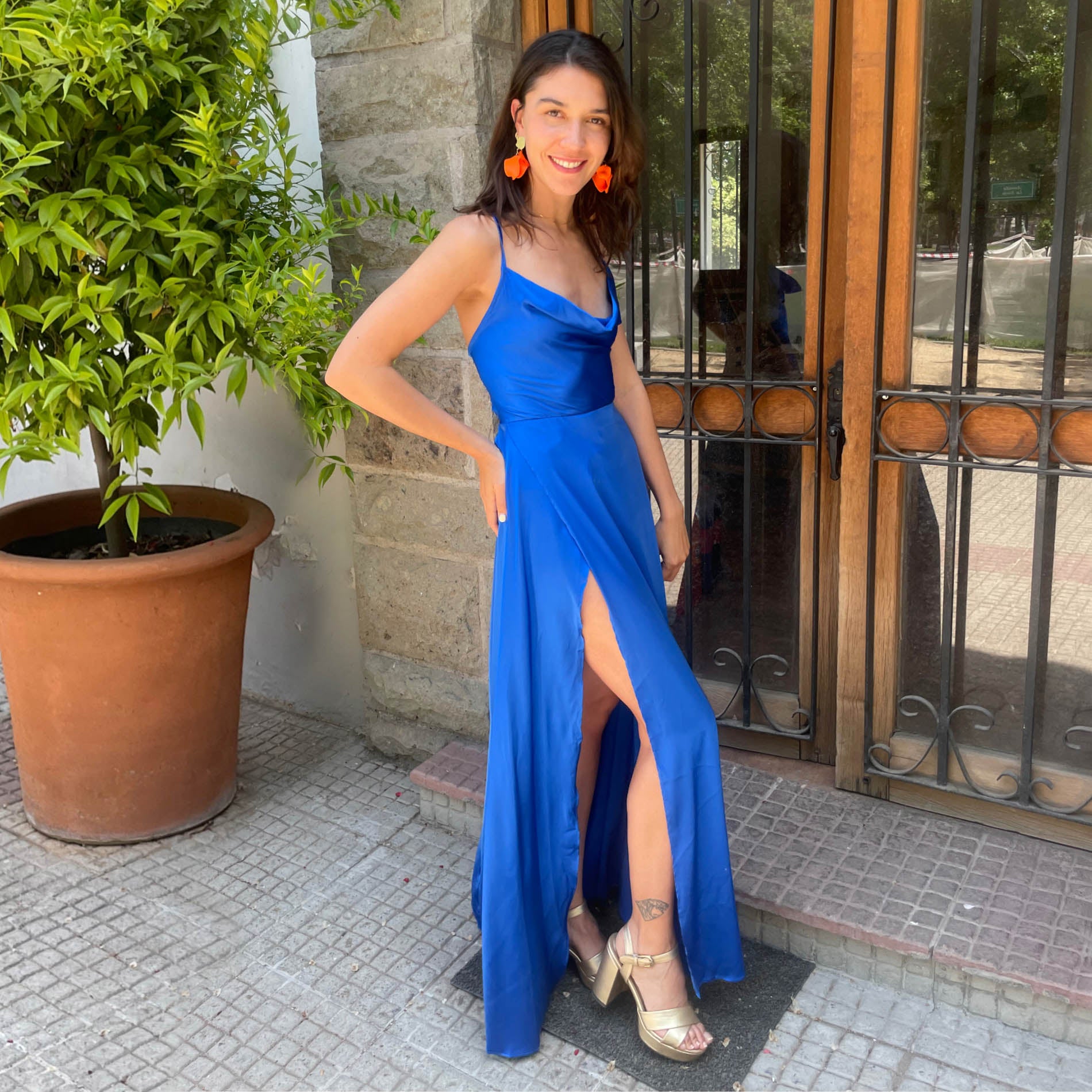 Si andabas buscando un vestido impactante pero fácil de usar, Octavia es tu match. Tiene un escote tipo cowl (sueltito y drapeado) que le da un toque elegante sin esfuerzo, breteles delgados con amarra cruzada en la espalda y un tajo alto que alarga visualmente las piernas. El tono azul eléctrico es protagonista por sí solo y se ve increíble tanto de día como de noche.