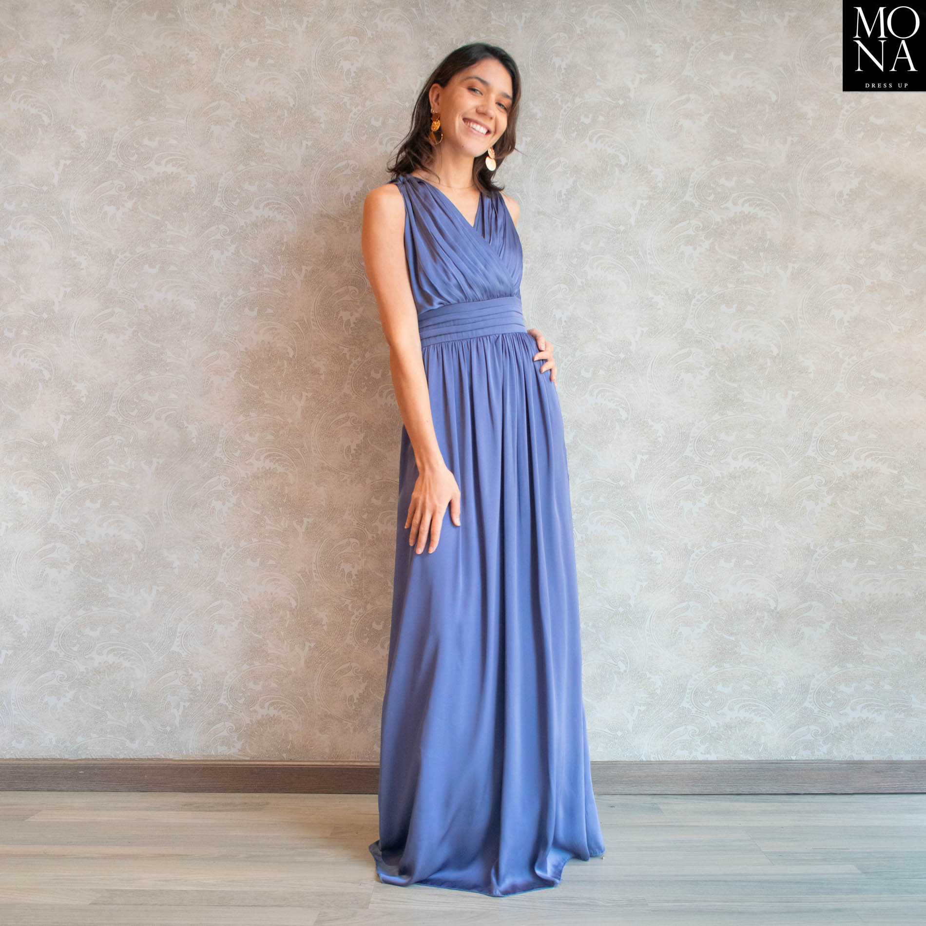 Este vestido es ideal para quienes buscan un escote que realce sin mostrar demasiado. Además, la tela plisada cae con peso, por lo que no marca ni se sube al caminar. Súmale unos aros llamativos o un peinado recogido y vas a estar lista.