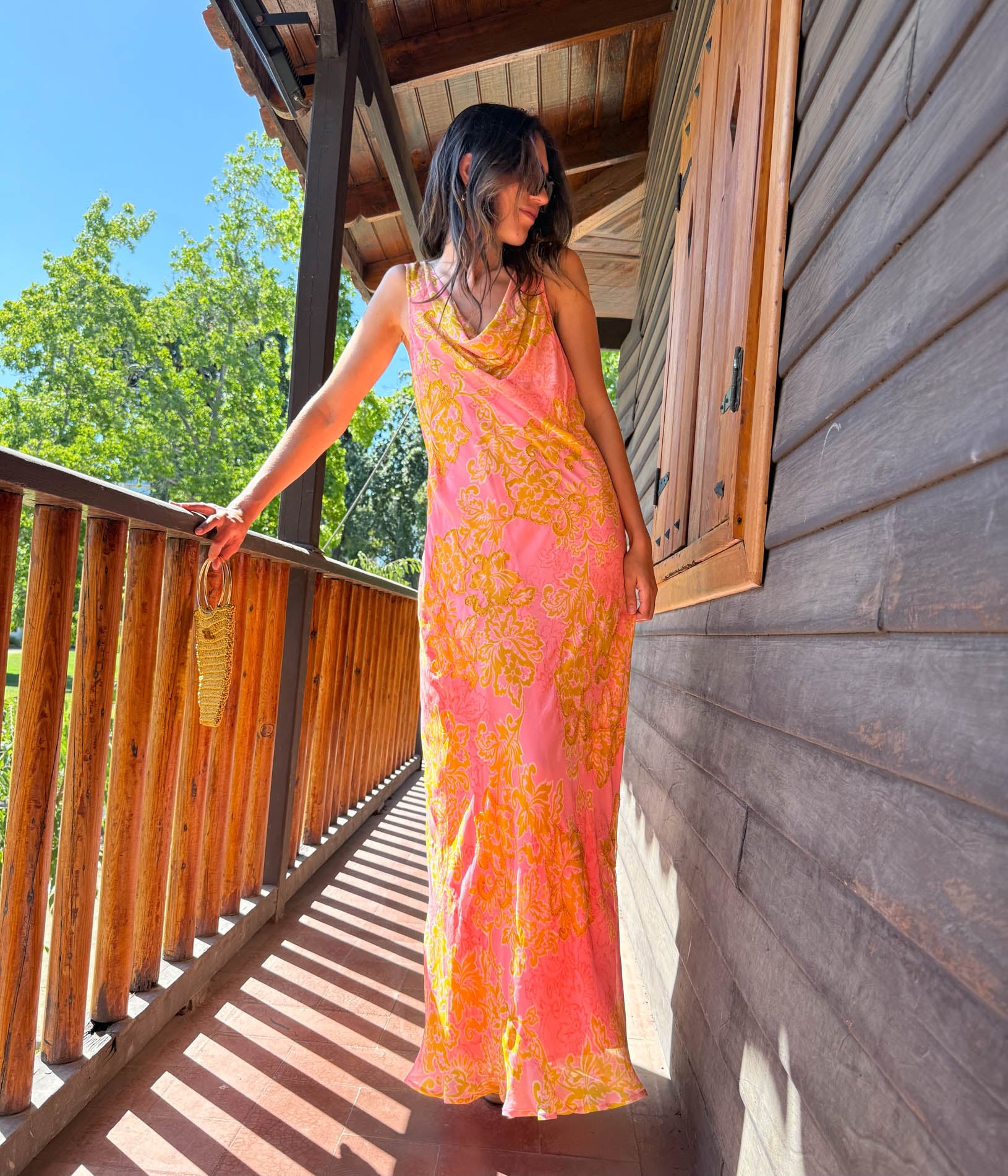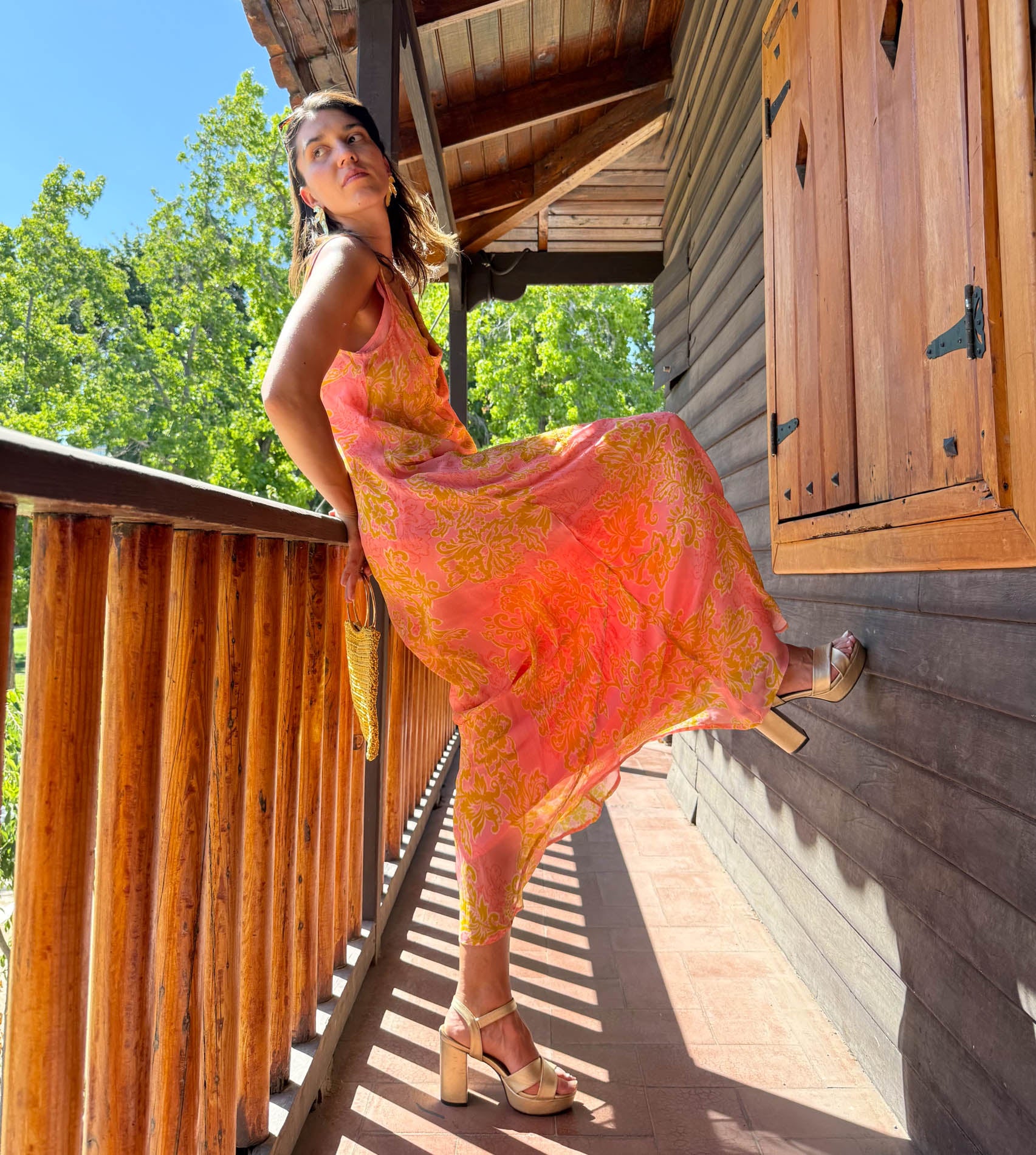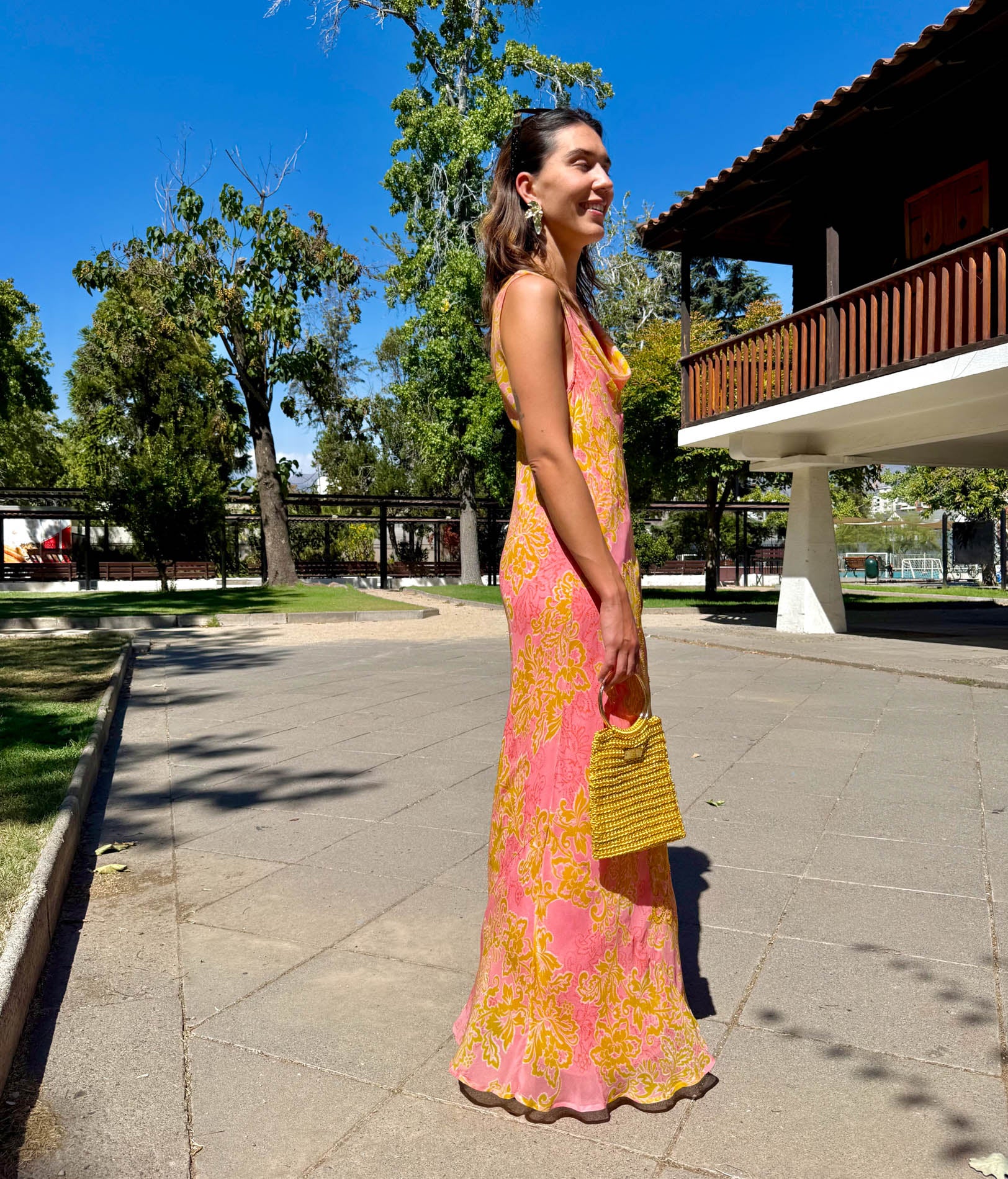 ¿Buscabas ese vestido que vibra alto, tiene onda y además es fresquísimo? El Trinidad es todo eso y más. Largo, con una caída liviana que se mueve contigo y un print soñado en tonos rosados y mostaza que grita verano, además de los canutillos bordados en el frente. El escote tipo drapeado en el delantero le da un toque relajado pero chic, mientras que la espalda en V y el calce suelto hacen que sea tan cómodo como estiloso.